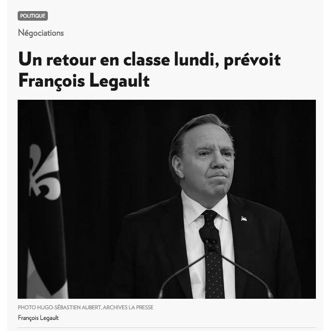 Il y a quelques jours, ça allait « brasser », puis finalement « ça va très bien ». Le chaud et le froid d'un premier ministre qui pense sans doute que ça va marcher l'affaire de mettre l'échec des négociations sur le dos des enseignant·es. Soutien au grévistes!